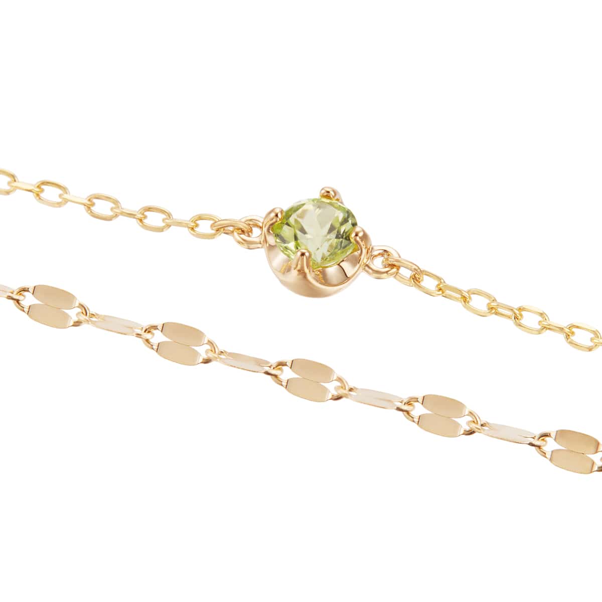 アズキチェーンとペタルチェーンが、手元できらきらと煌めき、華やかな印象に。
