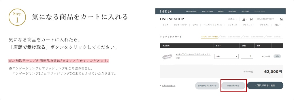 ※店舗取寄せのご利用商品点数は2点までとさせていただきます。※エンゲージリングとマリッジリングをご希望の場合は、エンゲージリング1点とマリッジリング2点までとさせていただきます。